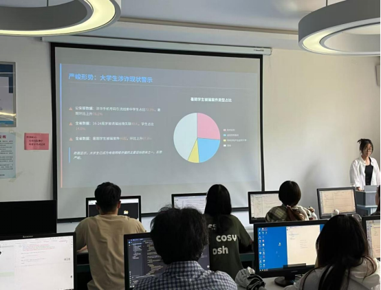 活动重点聚焦学生群体高发防诈场景,通过案例剖析、数据解读与互动问答,提升学生对网络诈骗危害的认知与防范意识。结合近期典型案例与数据,详细剖析骗子以“低风险、高回报”诱导学生租借、出售手机号、微信号、银行卡的诈骗圈套,解读当下高校防诈形式,阐释涉诈法律后果。现场互动问答环节围绕“如何防范个人信息泄漏”引导学生主动思考、积极作答,强化了防范技巧的实操性,实现反诈教育的渗透式覆盖。
