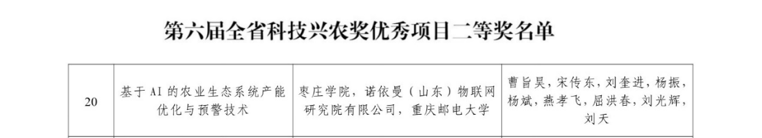 近日,第六届全省科技兴农奖评选结果正式公布。我校信息科学与工程学院(人工智能学院)教师曹旨昊主持申报的《基于AI的农业生态系统产能优化与预警技术》项目,荣获第六届全省科技兴农奖优秀项目二等奖。